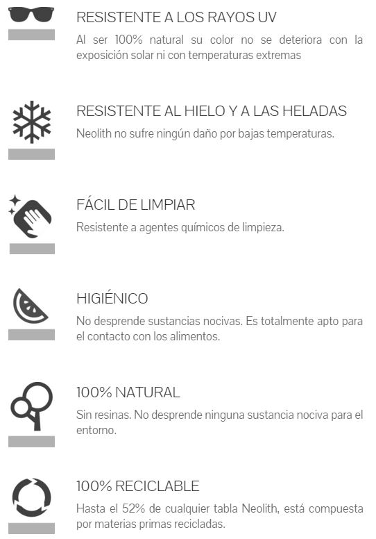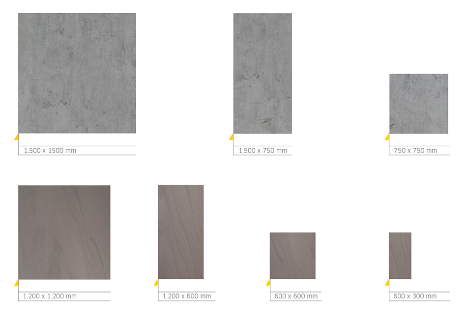Neolith presenta distintos formatos de baldosa destacables por su gran formato: 1.500 x 1.500, 1.500 x 750, 750 x 750, 1.200 x 1.200, 1.200 x 600, 600 x 600 y 600 x 300 mm.